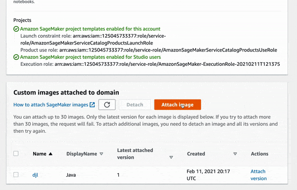 Once you have done the previous two steps, you can just use SageMaker Studio console to "Attach Image" to add the custom image from the ECR. Since the image itself is pre-built with all default SageMaker settings, all you needs to do is to add a Java kernel from it. Type in the name "java" and display Name "Java" and you are good to go.